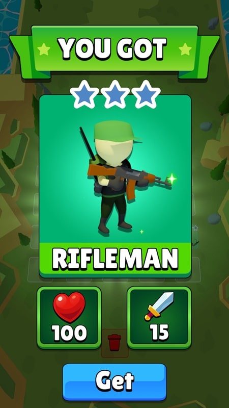 When you first join Army Merge: Tank Master APK, you will meet the first military unit, which is the infantry soldiers, their name is Rifleman. It is not difficult to see that the uniforms of these soldiers are basic moss green, with a backpack and a powerful AK-47 in hand. The way to upgrade them is to merge two soldiers of the same rank together. One star will create two stars, two stars will create three stars, and stats such as health and attack power will be upgraded accordingly. After completing the mission, accumulating enough purple gems, you can use them to unlock other military units such as tanks and soldiers with machine guns. Of course, upgrading also requires purple gems, so manage your spending wisely.