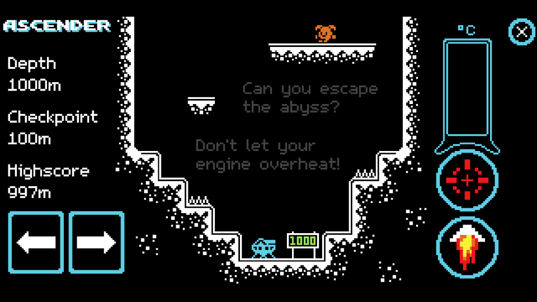 Immerse yourself in the nostalgic world of pixel graphics and chiptune with our unique 8-bit arcade game Ascender. Your journey begins in the depths of a mysterious chasm, where an exciting adventure awaits you, full of trials and dangers. Navigate through challenging landscapes using simple and intuitive mobile controls. But be careful: your engine may overheat if you're not attentive. To reach the top, you'll have to balance speed and control, strategically planning each step. The game offers 1000 meters of unique level design, featuring various obstacles, secrets, and cute enemies to defeat. Every 100 meters, you'll find a checkpoint where you can catch your breath and prepare for the next stage of ascent.