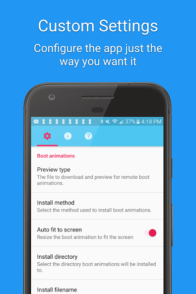 Boot Animations (Premium) - Application for replacement of standard animations using the device. The library has a lot of options animations. All options are available to preview before ustanovkoy.Vnimanie: some animation because of its size can be loaded up to 1-2 minutes! For the operation of the program requires root privileges.