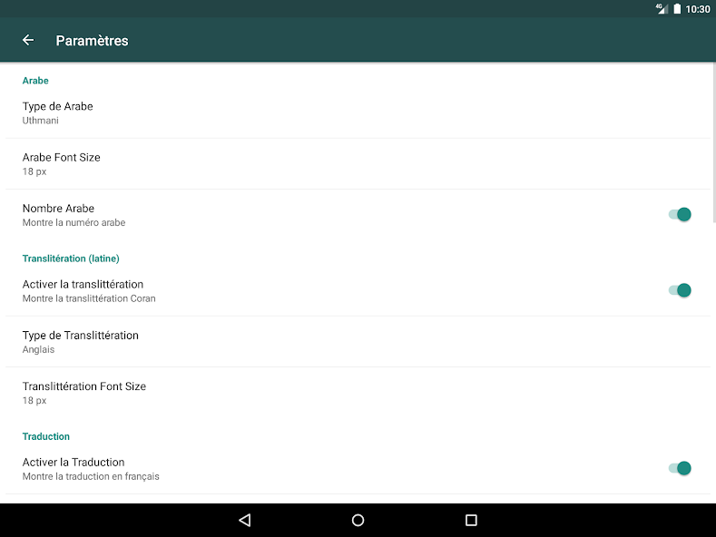 After installation, launch Coran Français Mod and tap the hidden "Mod Menu" icon that appears in the bottom‑right corner of the main screen. Enable "All Reciters" and "Widget Unlock" switches; changes take effect immediately.