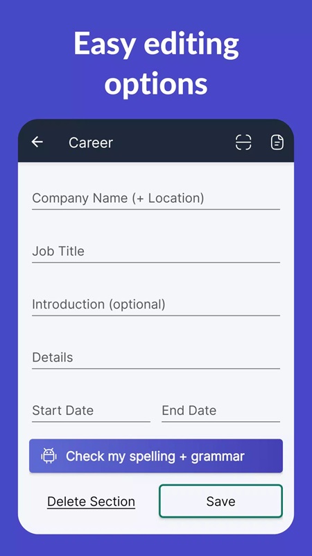 CV Engineer MOD 18.01.33 allows users to freely edit their CV flexibly according to their wishes. You can easily adjust some information such as company name, job title, job description, start date and end date. This is an ideal feature for those who want to design and build their own CV content in their own style. In addition, CV Engineer MOD APK also allows you to enter and edit information quickly.The system will automatically help you re-align the presentation of your CV content to make it perfect before use. Thanks to the use of bullet points, the description of your work experience and skills will be more prominent and clear in the eyes of the employer.