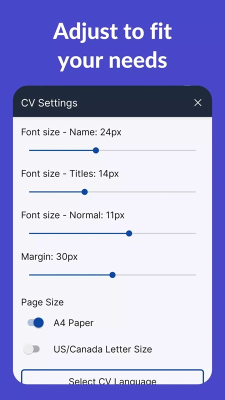 Depending on each person’s needs, CV Engineer MOD APK allows you to customize the format and layout of your CV. You need to access the CV settings section, then customize the font size of the name, CV title and content. Once the font on the CV has been set, users need to choose the font size and paper size to create a CV, CV Engineer MOD APK offers two options: A4 paper and standard paper according to the US or Canada. For example, you can adjust a CV with a name size of 24px, title of 14px, content of 11px and margins of 30px with a page size of A4 paper size. Users can also choose and adjust the color of the margins and the color of the text displayed on the CV to their liking, to create an impressive CV while still ensuring standard formatting.