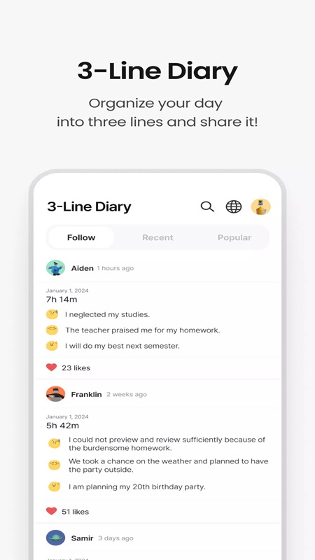 Every day you should create a personal diary for yourself with a maximum of three lines on Dote Timer MOD APK, telling the stories you encountered that day. Users just need to click on the pen icon in the Three Lines a Day section to start the creation process. A complete diary needs to have complete data such as creation time, content, and accompanying illustrations. Regarding the content, the application only displays three questions including how are you today, what are you happy about today, and the next plan you want to do. All the diary entries you have posted are displayed on the diary pages of other users. You can search for other diaries through three sections such as Following, Recent, Popular.