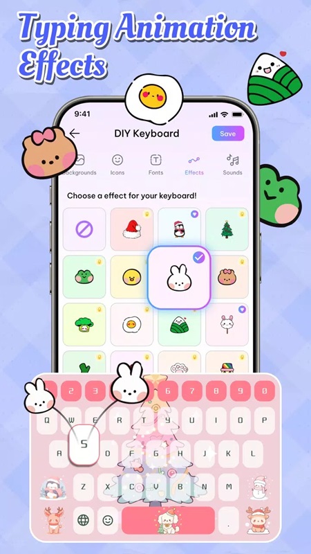 Users can also add animated effects that Emoji Font Keyboard & Themes MOD APK brings to decorate the keyboard. With a variety of animated effects, from cute images such as white rabbits, green frogs, yellow chicks to festive symbols such as Santa Claus, pine trees and many other cute effects. To choose the right effect, just go to the Effects category and start choosing. With this feature, every time you type any key, animated effects will appear, adding liveliness to the keyboard. The effects are all meticulously designed, with small sizes and combined with smooth motion effects, without causing the feeling of slow typing. Thanks to such a diverse library of effects, you can regularly change effects to enhance your typing experience.