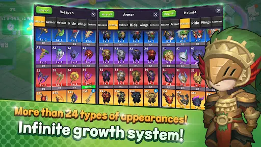 Idle Iron Knight offers a wide range of abilities to upgrade the knight. The upgrade system includes weapons, armor, vehicles, hats, wigs, and costumes. There, gamers will find a variety of items ranked from weak to strong and rare. To own them, they will need to pay gold coins and even gems. Weapons, vehicles, armor are equipment to increase combat ability. Meanwhile, the wings and outfits highlight your knight, making him more and more cool and impressive.