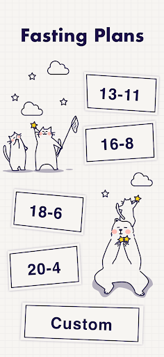Create your own fasting plan 13-11, 15-9, 16-10, 16-8, 18-6, 20-4, 23-1, 24, 36, 48, Custom