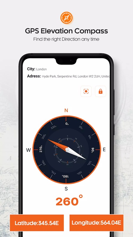 If you are an explorer who wants to find out the exact height of everything around you, My Elevation: Altimeter App Unlocked Pro is an indispensable companion. The application will provide users with an altimeter through the current location, so when moving to a location, you can measure the height there without having to perform many complicated steps. Besides, users can also use the GPS altitude compass to quickly find the right direction of travel. After searching, the compass will display the latitude and longitude. For example, if you want to search for an address Hyde Park, Serpentine Rd, London W2 2UH, just enter the address and press the search button. In a moment, My Elevation: Altimeter App MOD APK will provide information such as latitude: 345.54E, longitude 564.04E. Based on the compass needle, users can easily find the direction to move to the desired location.