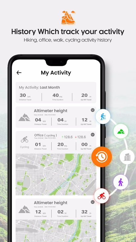 Not only is it an accurate altitude measuring tool, My Elevation: Altimeter App MOD APK also stores a history of extremely safe activities. The application will provide five main activities including hiking, walking, cycling, high mountain climbing, walking to the office. With the activities that have been performed, all data is stored in the history section, users just need to click on the activity they want to learn about, then My Elevation: Altimeter App MOD APK will give a detailed data table including time and distance. For example, if you want to review the history of mountain climbing data in the past month, just click on the mountain icon, the data will be displayed, such as the distance is 12km and done within 2 hours. In addition, the application also helps you compare the difference between the data after each implementation, it can increase or decrease.