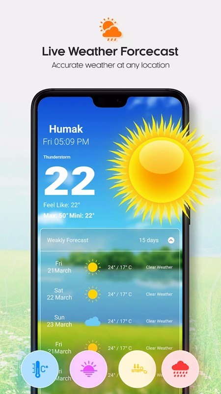 In addition to the above features, My Elevation: Altimeter App MOD APK also provides users with accurate weather forecasts in many different locations. To get highly accurate forecast data, users need to provide their current location to the application. In the forecast section, My Elevation: Altimeter App MOD APK will provide weather data for 15 days, including actual temperature, rainfall, water level, for more detailed information about the weather of the day, users can click on that day and view. For example, if you want to see the weather in Humak on Friday, March 21, with the data provided by My Elevation: Altimeter App MOD APK, you will see that the weather that day is clear, with temperatures ranging from 24° – 17°C.