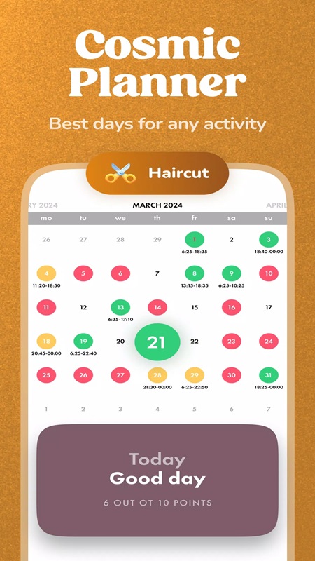 In the Planner section, Navamsha MOD 4.8.7 has provided 43 different activities for you to freely choose. For each category, the system will suggest some possible jobs that you should refer to. The prominent categories that you can choose from are Beauty, Health, Home, Gardening, Children, Other, Business activity. Users just need to click on any category that they want to learn about, the appropriate jobs will appear immediately. For example, with the Business activity category, there will be jobs such as conducting business transactions, large purchases, starting a business project. Then, Navamsha MOD APK displays a calendar with the days to start the jobs you have selected. The best day on the calendar will be displayed in yellow, good days are green and red is a bad day that should not do big jobs.