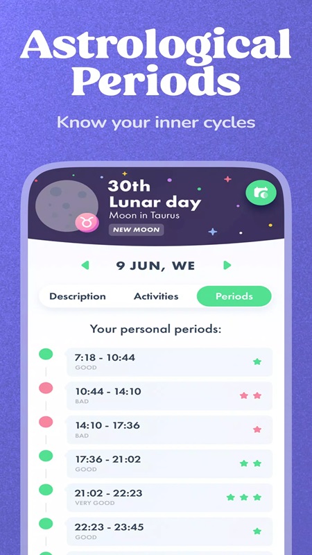 Navamsha Unlocked Premium helps users quickly grasp information about astrology, birth charts, zodiac signs, spirituality, and numerology. To track the lunar calendar during the year, users need to access the Calendar section. The system has displayed the necessary data for you to learn such as Description, Activities, and Periods. The lunar calendar will help you determine the days when you attract a lot of positive energy, which is very suitable for achieving goals in many aspects such as business and health. In the Description section, there will be some information related to good time frames to fulfill personal wishes. If you want to see what tasks you should do that day, you just need to access the Activities section. The application allows you to calculate your daily astrological cycles right on the system in the most accurate way.