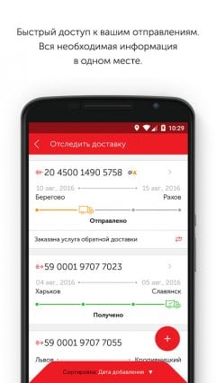Nova poshta - mobile client eponymous courier services operating in Ukraine. With the help of this program, the clients will become even easier to send and receive packages. The application can find all the necessary information: addresses of points of sending and delivery, contact numbers, schedule of work. The user also learns about the peculiarities of transportation of certain shipments, will be able to calculate the cost and date of delivery, to carry out the tracking number and call the employee of the courier service at the house.