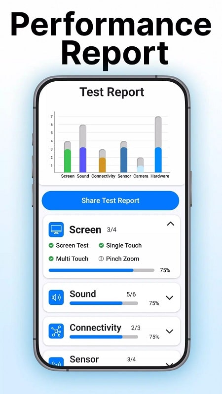 Each phone has its own operating system, depending on the installed version or the applications downloaded and used. In particular, this application is useful in the process of checking old phones, ensuring all indicators are stable so you can decide whether to buy or not. The system evaluates the current status of the device at any time, creating a basic test whenever you see a problem. The screen, touch speed, flashlight, camera or speaker, microphone… are all tested for quality every day. These components can affect the user experience if there is an error and Phone Doctor MOD APK will detect it quickly.
