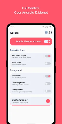 Changing QS tiles styleChange the look of the brightness slider on the flyMake accent colors transparent on the screenApply Amoled black background on any deviceChange status bar, battery icon, and moreAll theme styles and interface options are available with previews for users to see before deciding on a choice.A single click to apply changes without having to restart the deviceDark Mode for Media PlayerBesides, there are many other notable features that you should download this application to learn more about. Note that your device needs to be connected to the internet during the first installation to download the resource packs in Project Themer.