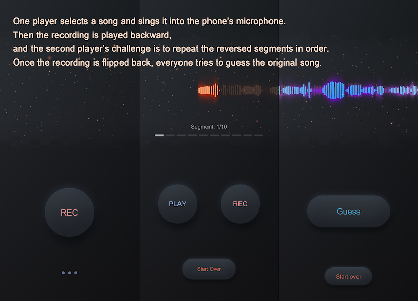 Reversong is a description of a musical game called "Reversong." The game is based on a competition from the TV show "Good Jokes" with Alexander Pushny. The essence of the game is that one player sings a song into the phone's microphone, the recording is reversed, and the second player must repeat the reversed . Then everyone tries to guess the original song. Key features of the game: - Unique gameplay with song reversal - Completely free, without ads or in-app purchases - Suitable for parties and gatherings with friends - Develops hearing and memory The game is positioned as a fun entertainment for groups that requires no expenses. The developers promise only enjoyment from the game without any distracting factors.