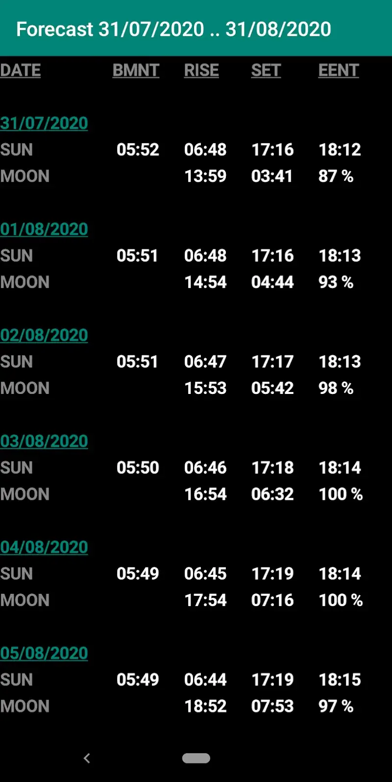 CALCULATE AND CREATE A FORECAST TABLE FOR THE SUNRISE AND SUNSET TIMES OF THE SUN AND MOON