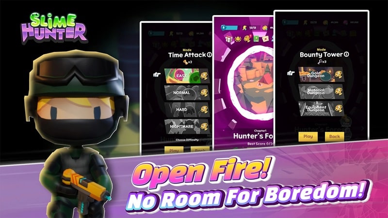You will stand up to represent the human world, fighting in different missions. And then you will have to confront slimy creatures that have evolved intelligence. They absorb everything into their power and have turned into evil creatures. So, it would be best if you became a brave hunter to prevent them from continuing to destroy all lands. With your fighting talent, you will use guns to confront and defeat them all. However, to do that, you need to persevere in fighting with your courage and selflessness. Download Slime Hunter:Hyper Casual Game MOD APK to destroy all the slime destroying the world.