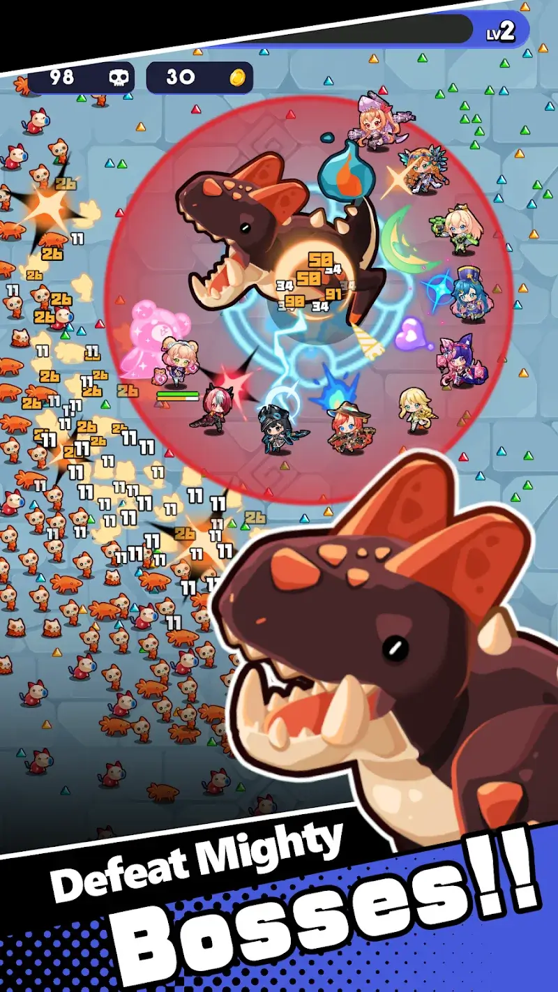 Fast-paced action: You will be overwhelmed by the scale of the arena. The game creates giant arenas because your team will soon be surrounded by hundreds of little monsters. The game’s challenges will exploit the player’s reflexes and strategy-building in the most chaotic situations.