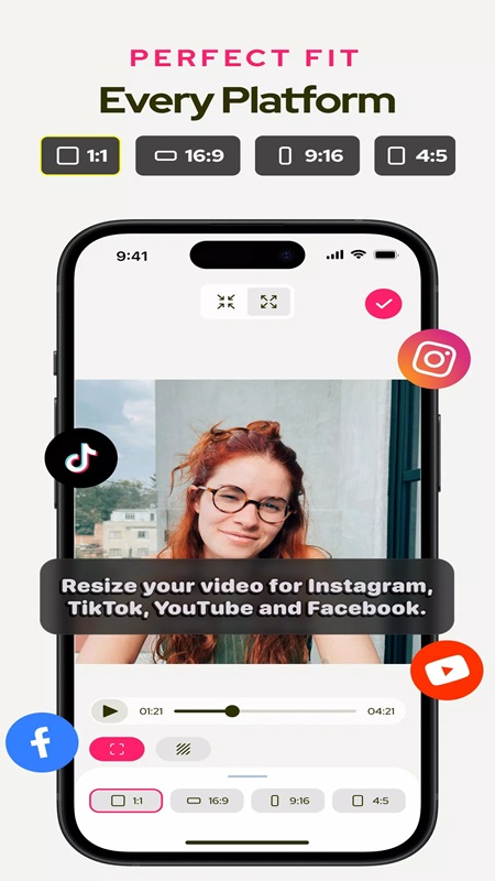To ensure videos are suitable for uploading, SUBCAP MOD APK integrates several video size options compatible with various social media platforms. You can choose from popular sizes such as 1:1, 16:9, 9:16, and 4:5. This makes it easy for users to share these videos on TikTok, Instagram, Snapchat, Facebook, Twitter, LinkedIn, and YouTube. The app allows you to switch between aspect ratios with just one tap, and preview the results directly on the screen to ensure the best possible result. Adjust, zoom in, or zoom out the video to keep the main content centered. Easily change the background color of the video with options such as blue, red, purple, yellow, pink, and orange.