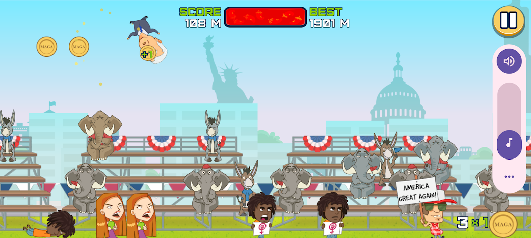 Trumped - Throw the Trump - In the midst of the election turmoil, you can now become part of the campaign to bring Murica back to its former glory. In this unique game, you will be immersed in a world of political intrigue, action and unexpected twists. Your mission is to collect votes, mobilize Trump supporters and simultaneously repel attacks from protesters. You will see Trump in the most unusual images: from a bunny suit to a freedom rocket pilot. Support the American Eagle, try your luck fishing with Sarah or test your skills in sparring with Mike. This game is the perfect way for representatives of both parties to take a break from the intense campaign. Throw, toss and send your favorite - or perhaps least favorite - candidate into the air.